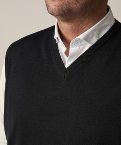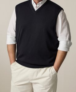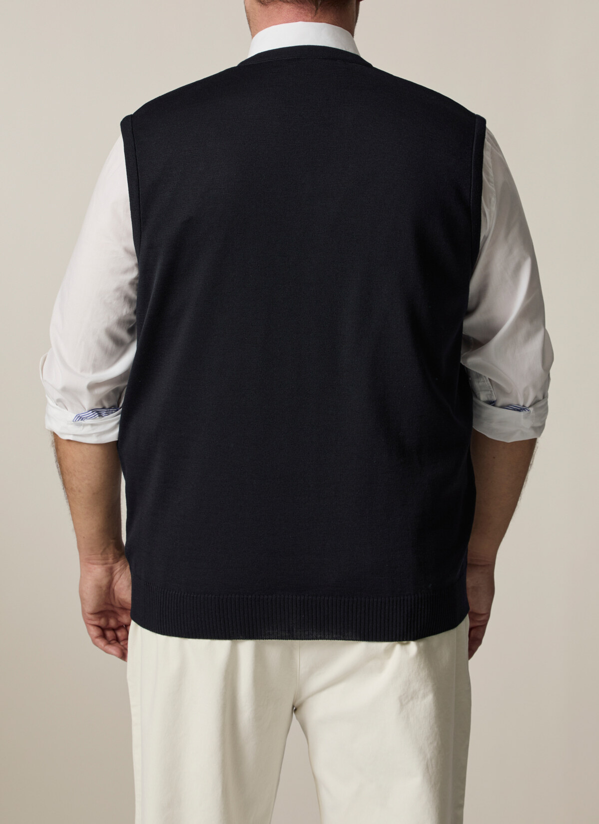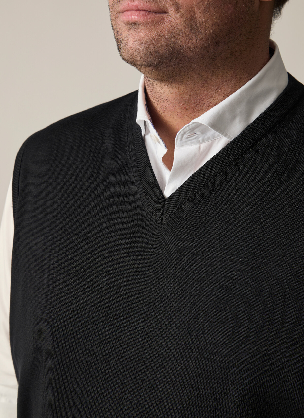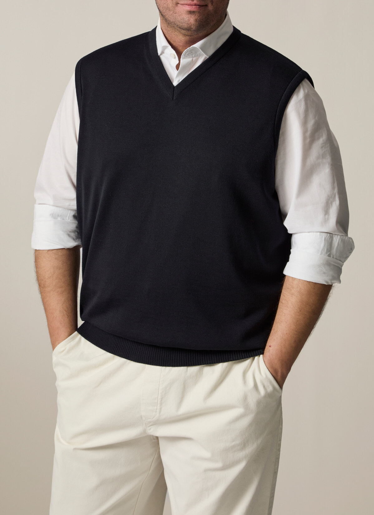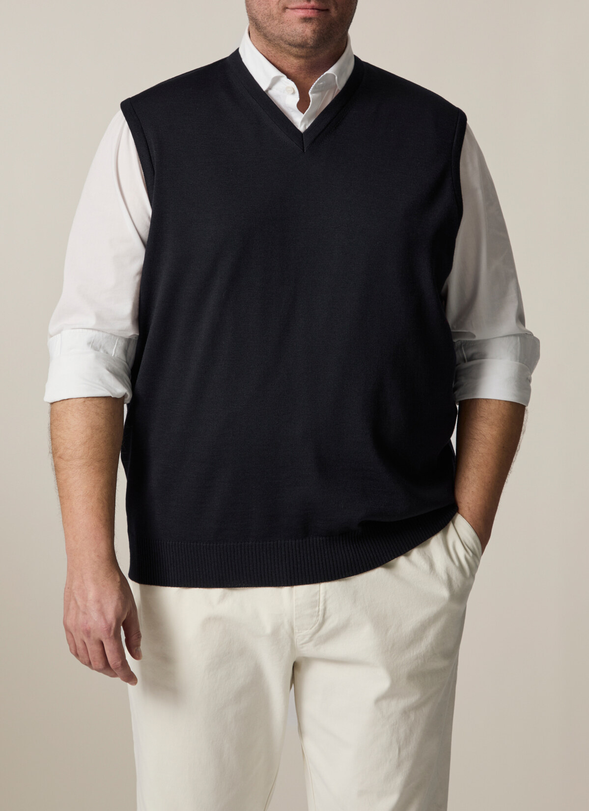 Cleanes Design trifft auf hochwertige Merinowolle! Pullunder mit V-Ausschnitt in großer Größe – ein Klassiker für jeden Tag. Material: Merinowolle hat einen hohen Tragekomfort, ist feuchtigkeitsregulierend, geruchsneutral und besitzt eine wärmende sowie temperaturausgleichende Funktion. Haptik: cleanes, klassisches Maschenbild mit weichem Wollgriff. Hochwertige Verarbeitung mit handgekettelten Nähten und elastischen Bündchen. Tragegefühl: leicht und angenehm wärmend.