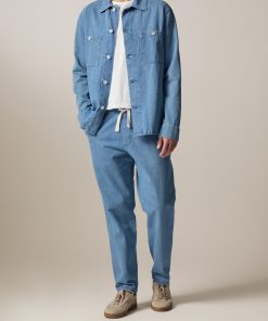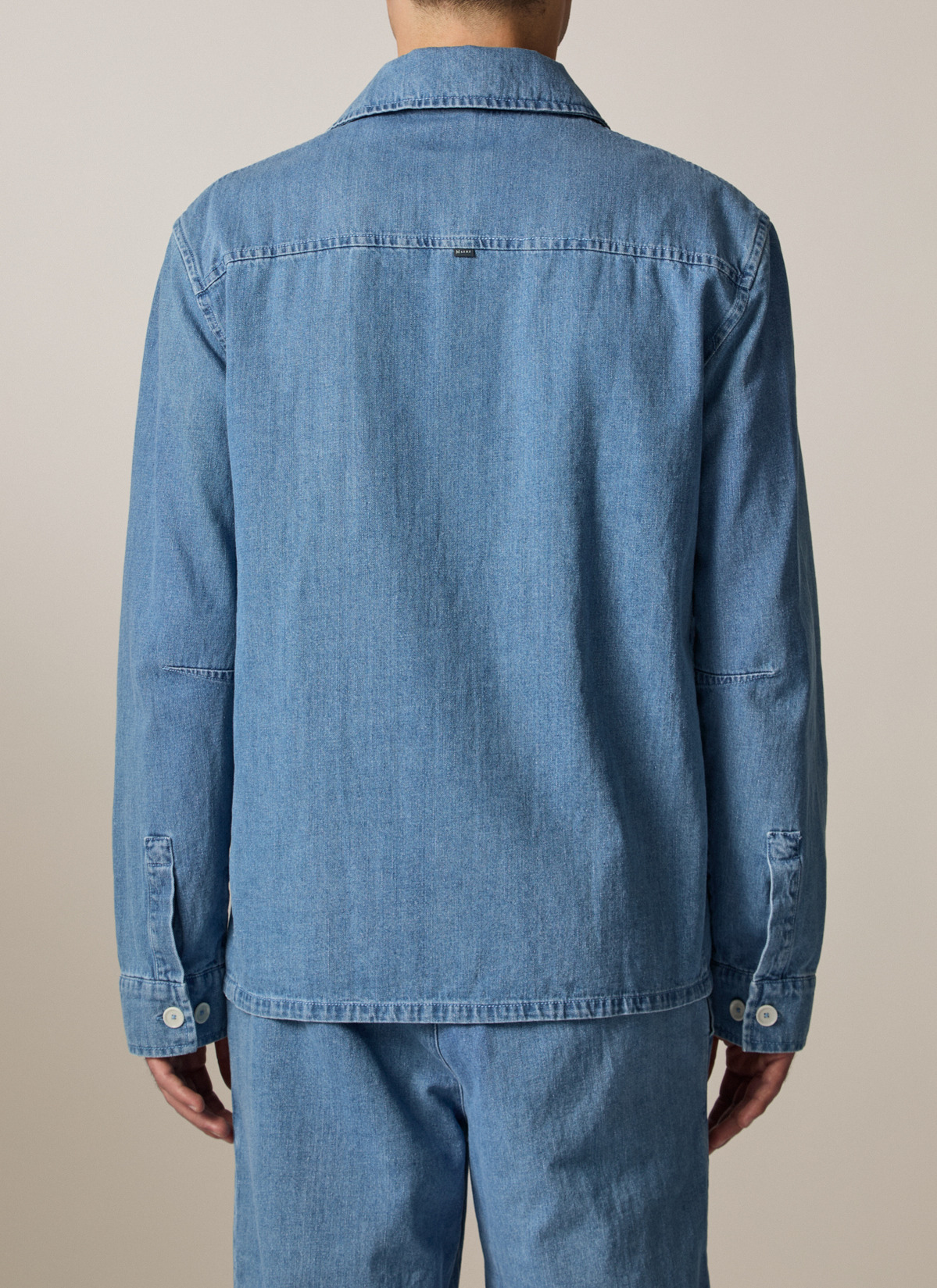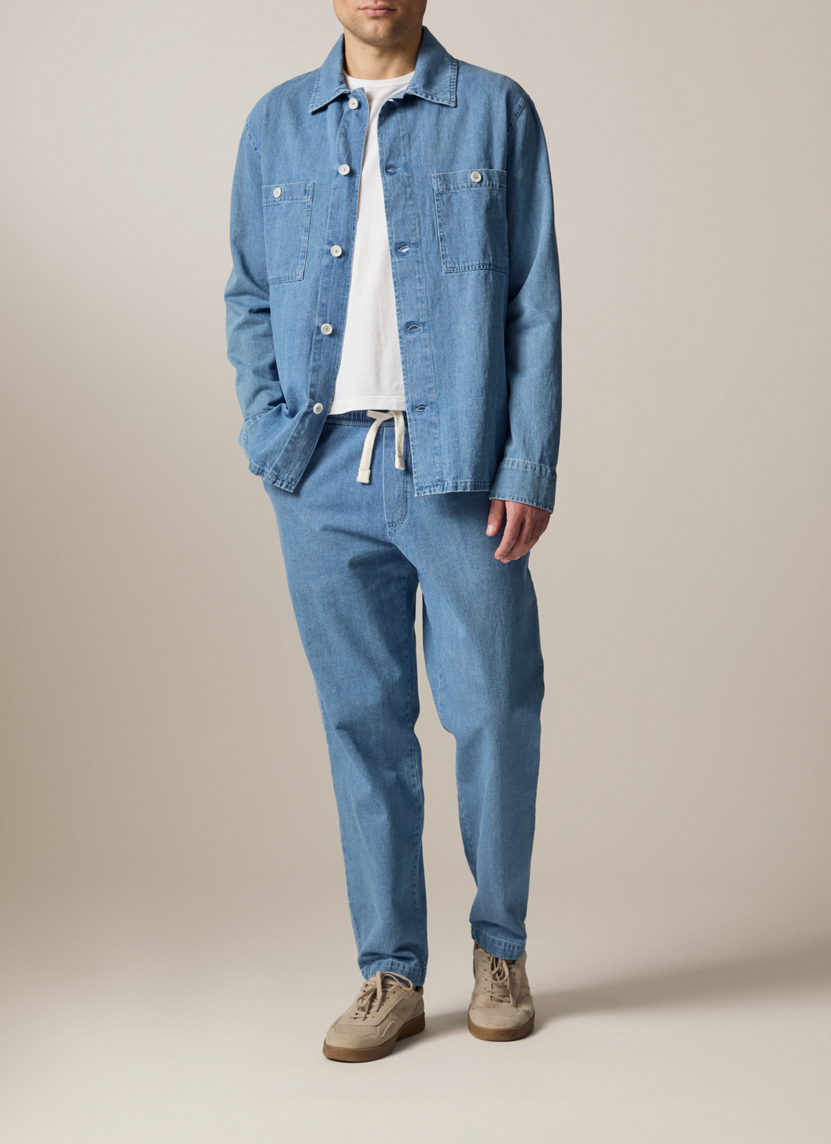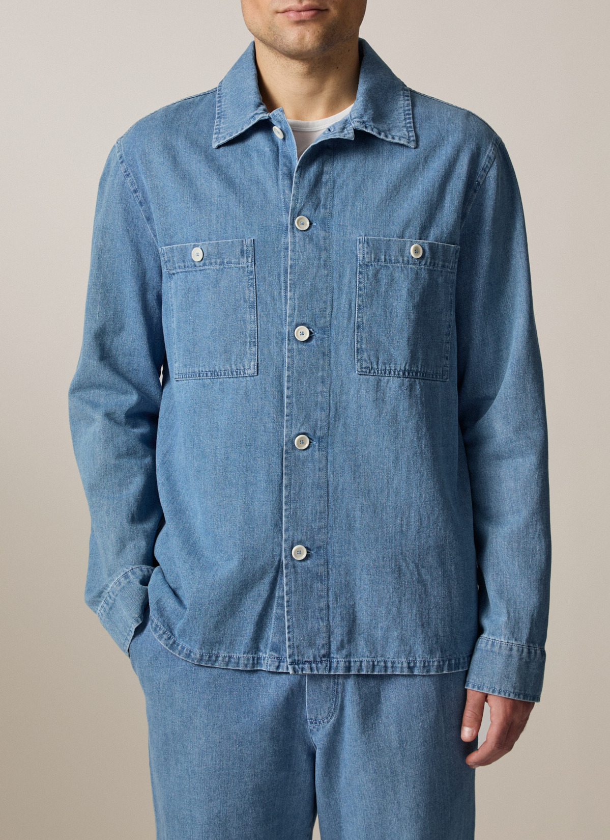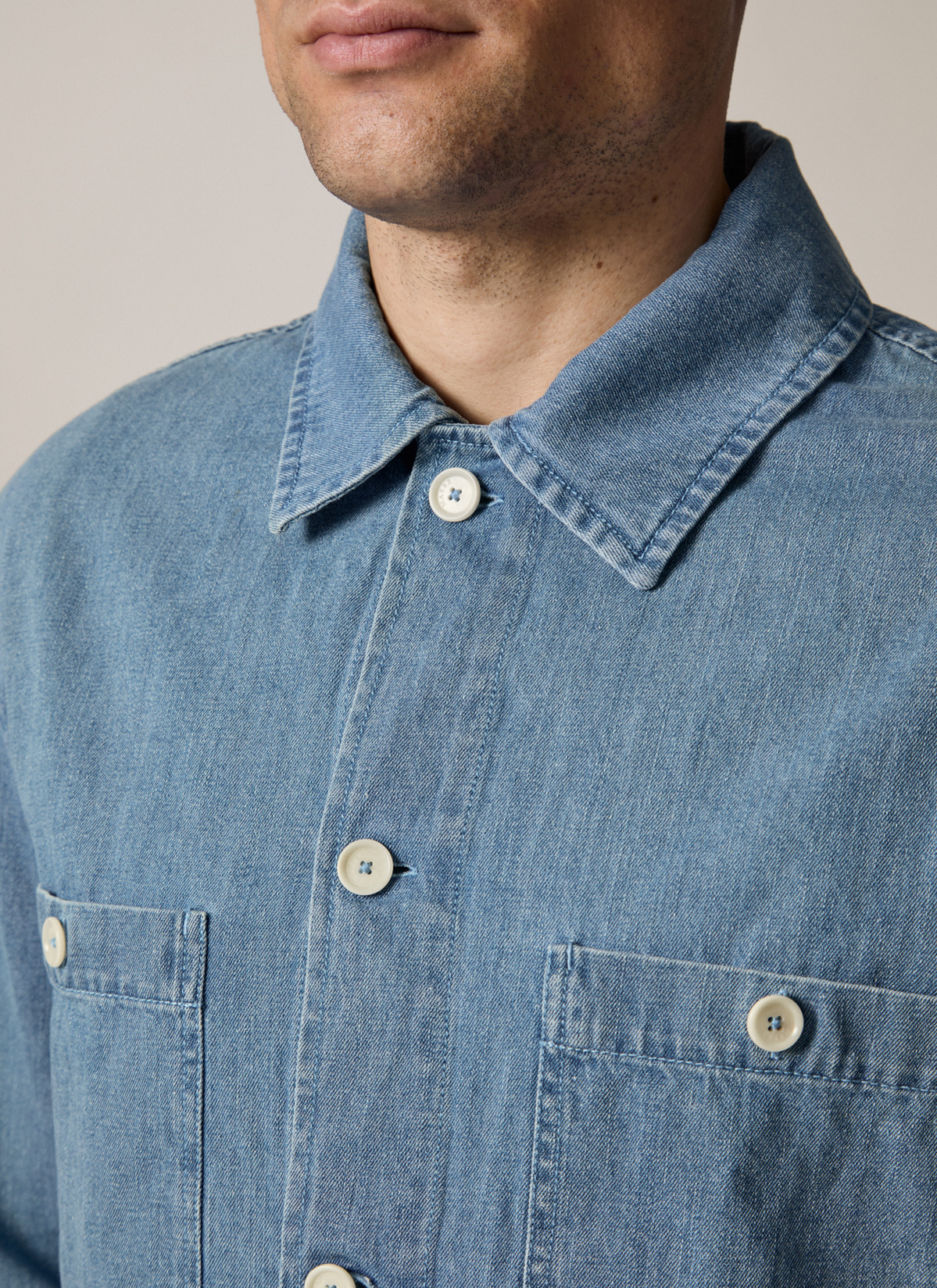 Die Jacke im Regular Fit zeigt sich im modernen Denim Look mit durchgehender Knopfleiste mit Statement Knöpfen. Der cleane Schnitt, der Umlegekragen sowie die aufgesetzten Taschen verleihen der sportiven Jacke einen eleganten Charakter. Material: während Baumwolle die Jacke besonders pflegeleicht und strapazierfähig macht, sorgt Leinen für eine strukturierte Oberfläche und Atmungsaktivität. Haptik: kernig und leicht im Griff. Styling-Tipp: kombiniert im Set mit der passenden Hose (Art. Nr.: 716500) entsteht ein moderner All-Denim-Look.