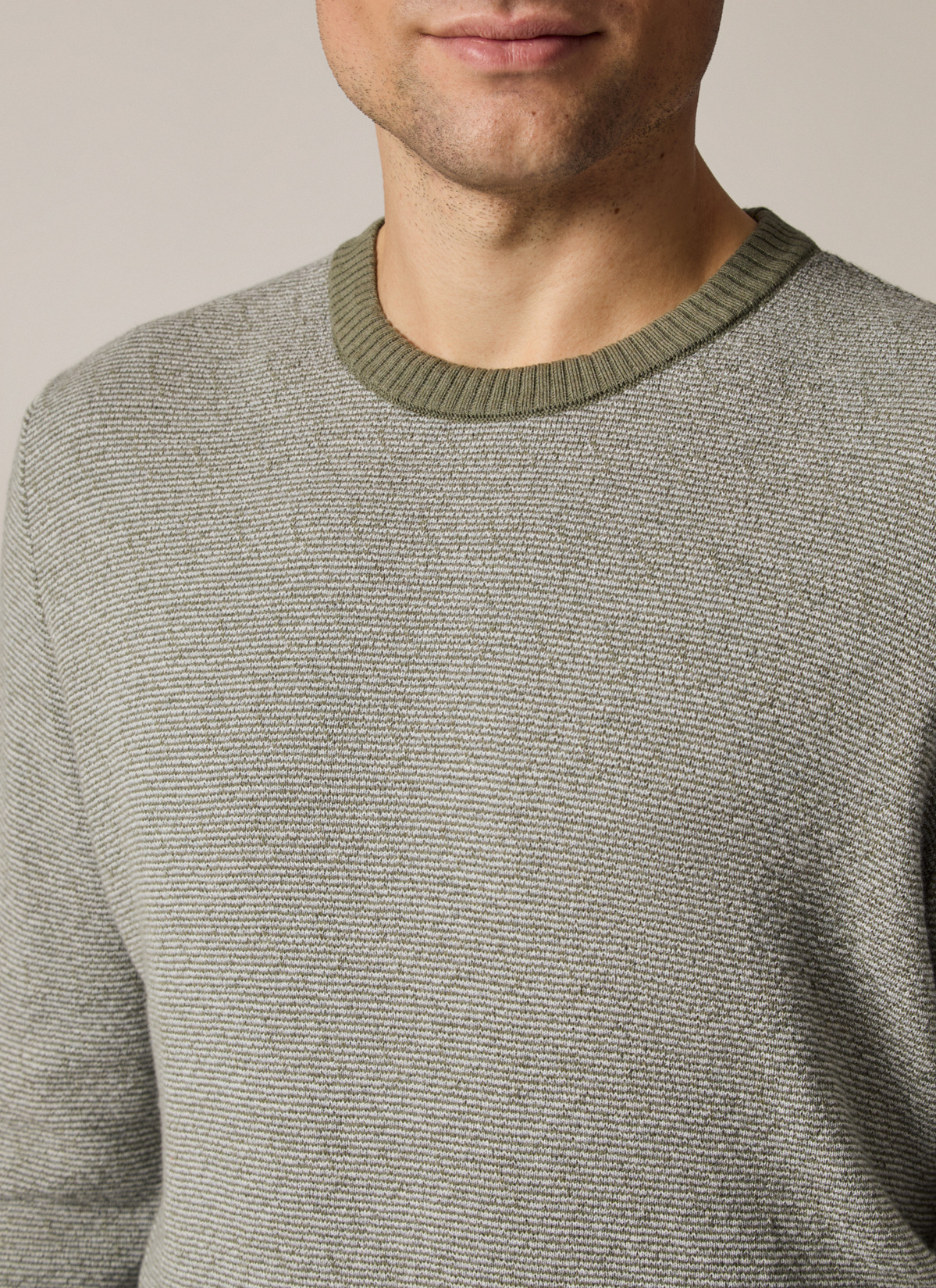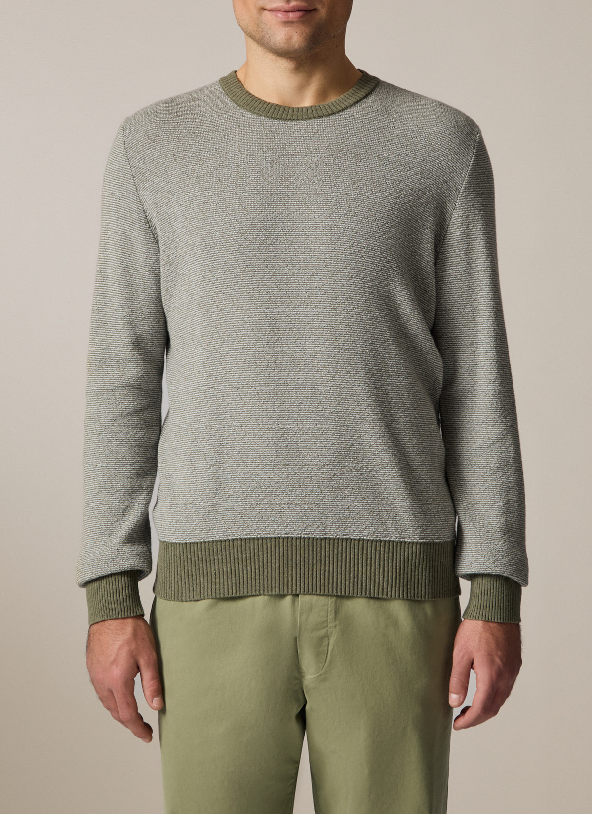 Ein Basic Pullover mit modernem Twist! Der Pullover zeigt sich im Regular Fit mit Rundhalsausschnitt. Durch die verschieden farbigen Garne entsteht ein markantes Muster, welches dem Pullover einen besonderen Charakter verleiht. Die uni farbenen Rippenbündchen an Saum und Ärmeln bilden einen harmonischen Kontrast. Material: gefertigt aus Baumwolle bietet der Pullover einen hervorragenden Tragekomfort und ist besonders pflegeleicht . Haptik: kernig und weich im Griff.