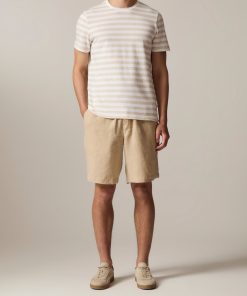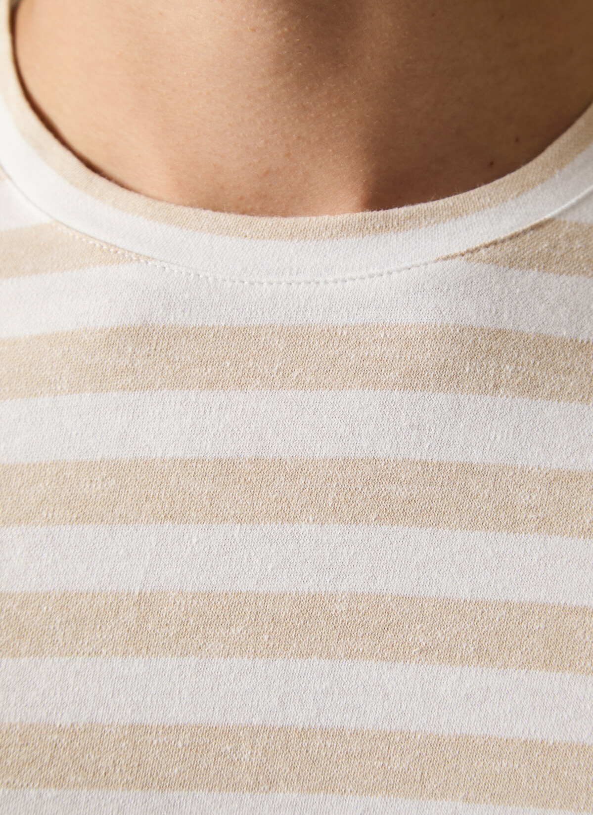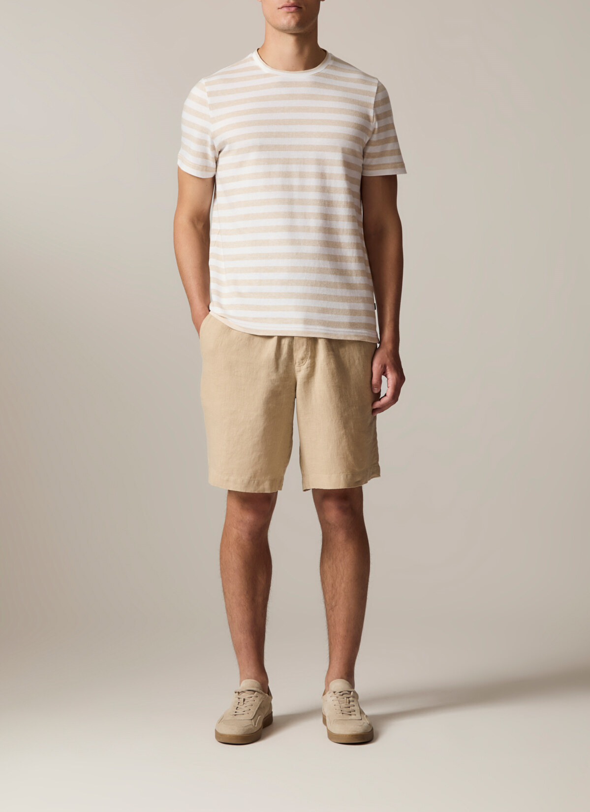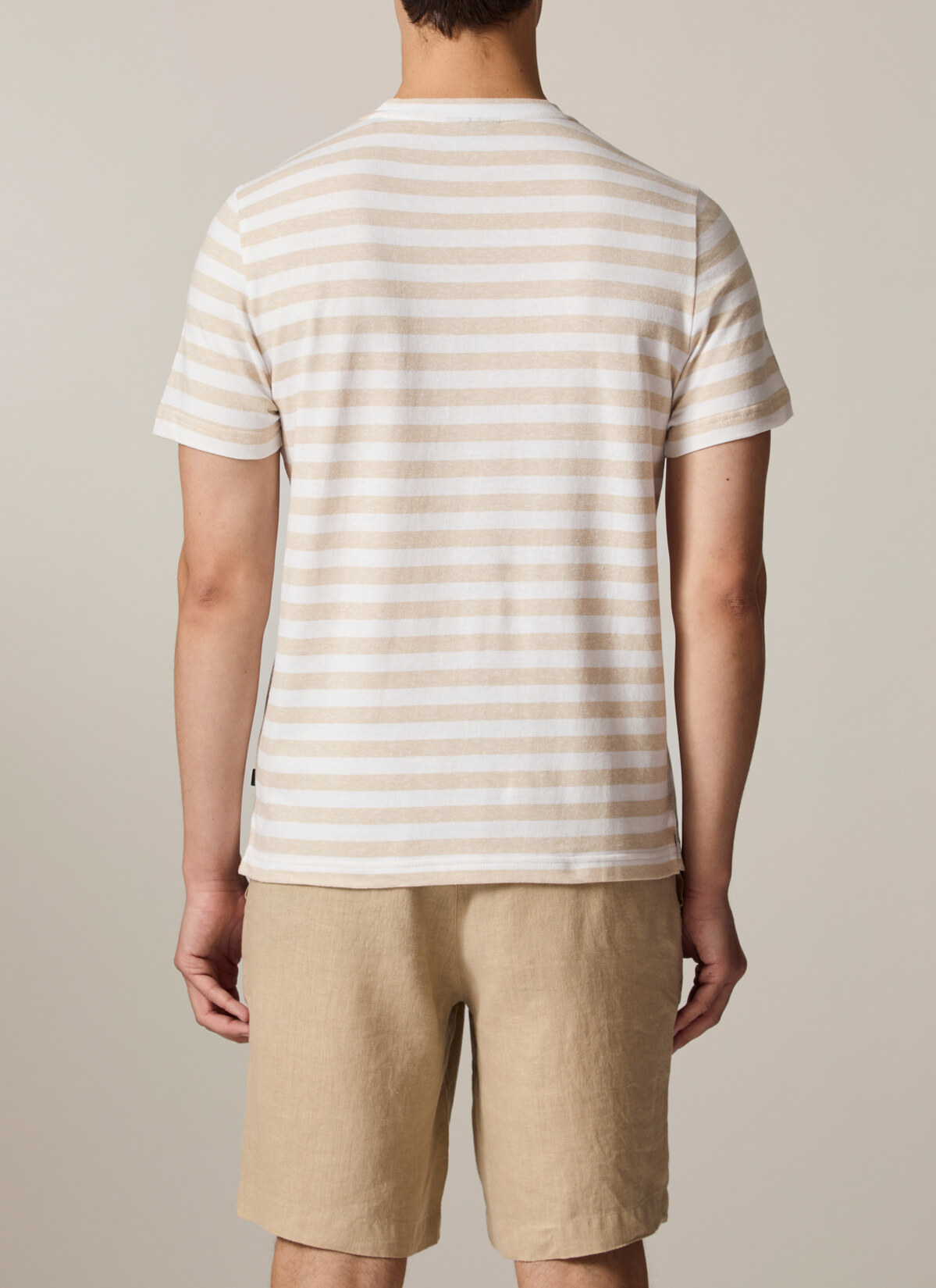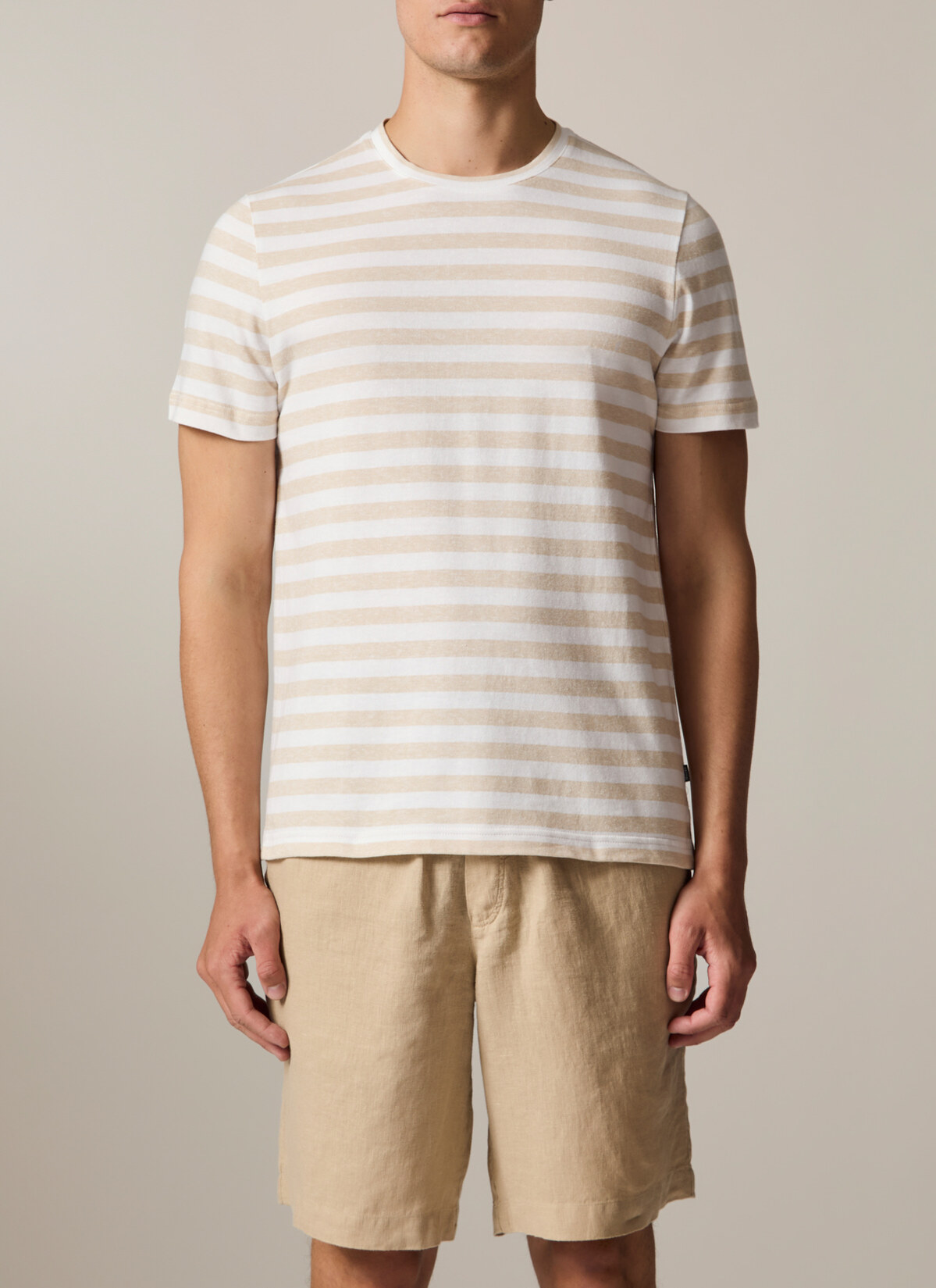 Das T-Shirt im Modern Fit präsentiert sich mit dezenten, horizontalen Streifen, die dem klassischen Design eine moderne Note verleihen. Material: gefertigt aus einer weichen Mischung aus Baumwolle und Leinen, bietet es einen hohen Tragekomfort, ist atmungsaktiv, leicht und feuchtigkeitsregulierend. Haptik: leicht und kühl. Styling-Tipp: Perfekt kombiniert mit einer lässigen Jeans oder Shorts für einen entspannten, aber eleganten Look.