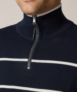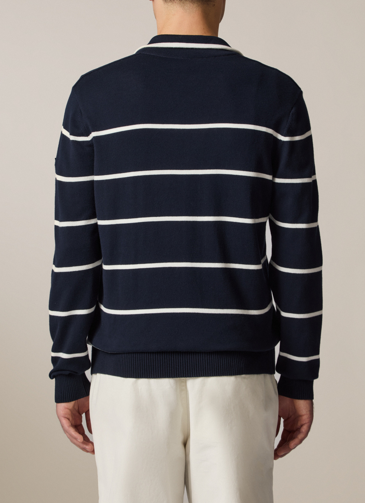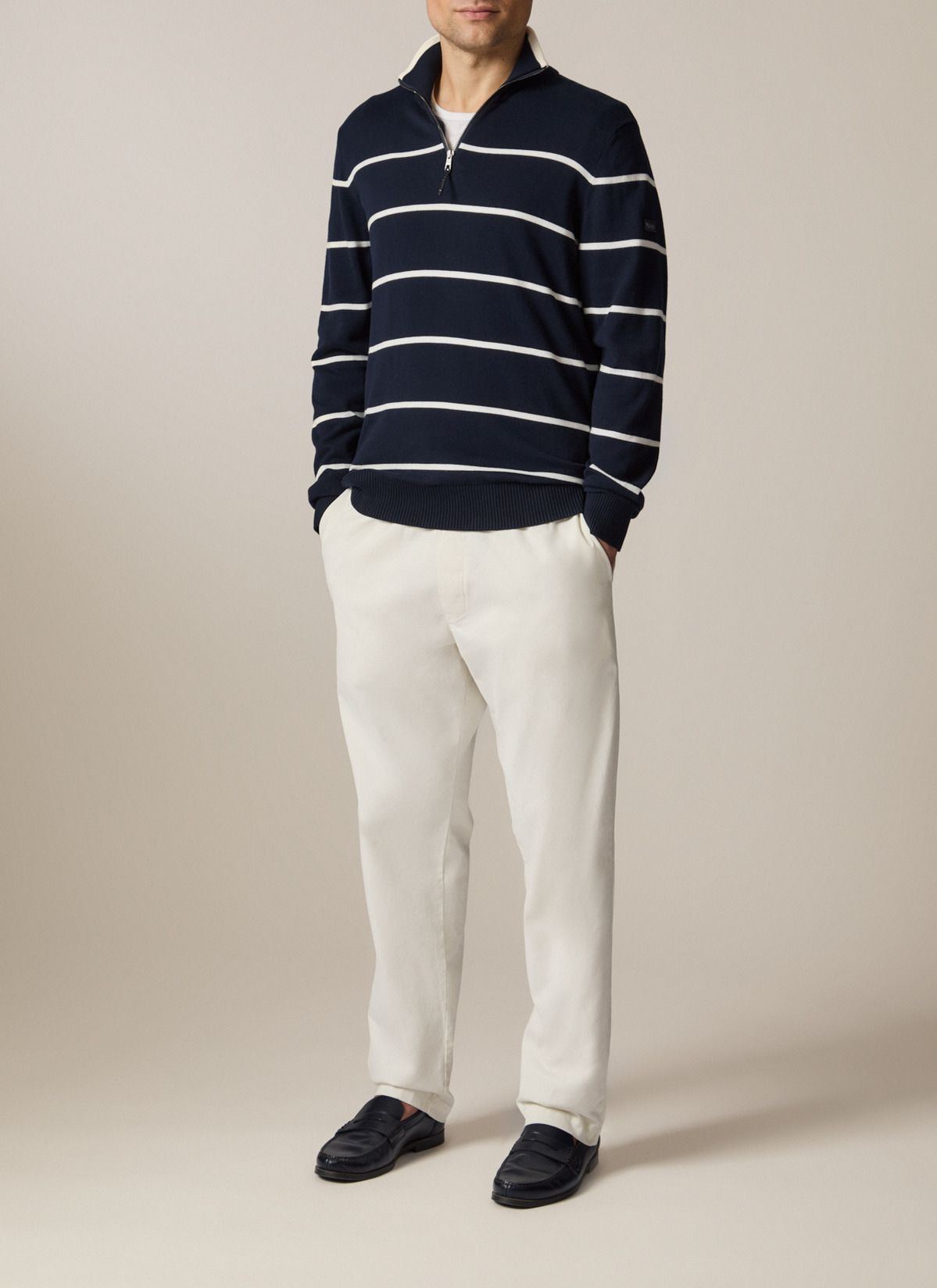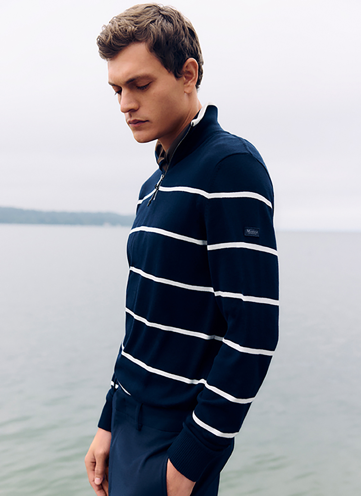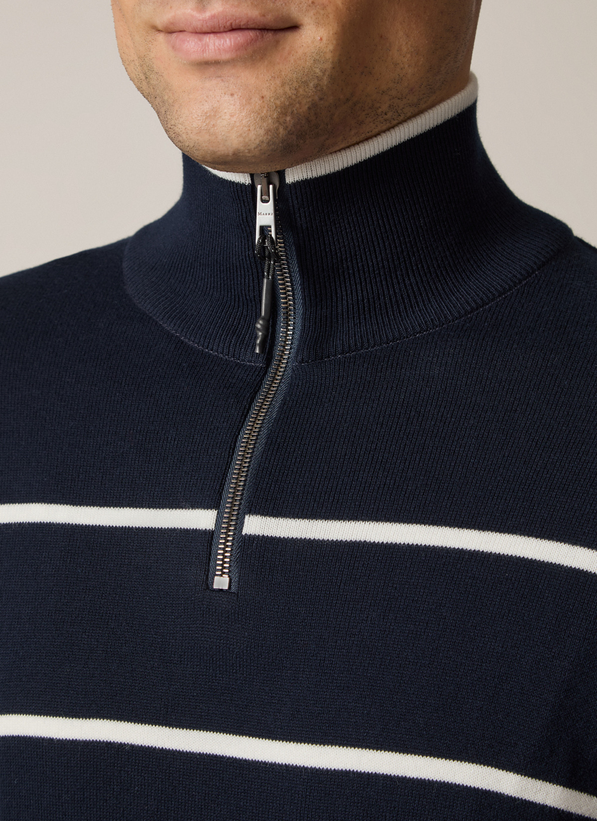 Der Pullover im Regular Fit zeigt sich mit Troyer Kragen und Streifendetails. Der Pullover überzeugt durch seinen klassischen, sportlichen Look und den praktischen Reißverschluss, durch den der Kragen je nach Wunsch geöffnet in eine Umlegekragen verwandelt werden kann. Material: gefertigt aus Baumwolle ist der Pullover besonders hautfreundlich und atmungsaktiv. Haptik: weich und leicht im Griff. Styling-Tipp: für einen Eleganten Look mit einer farblich passenden Stoffhose oder alltagstauglich zu Jeans.