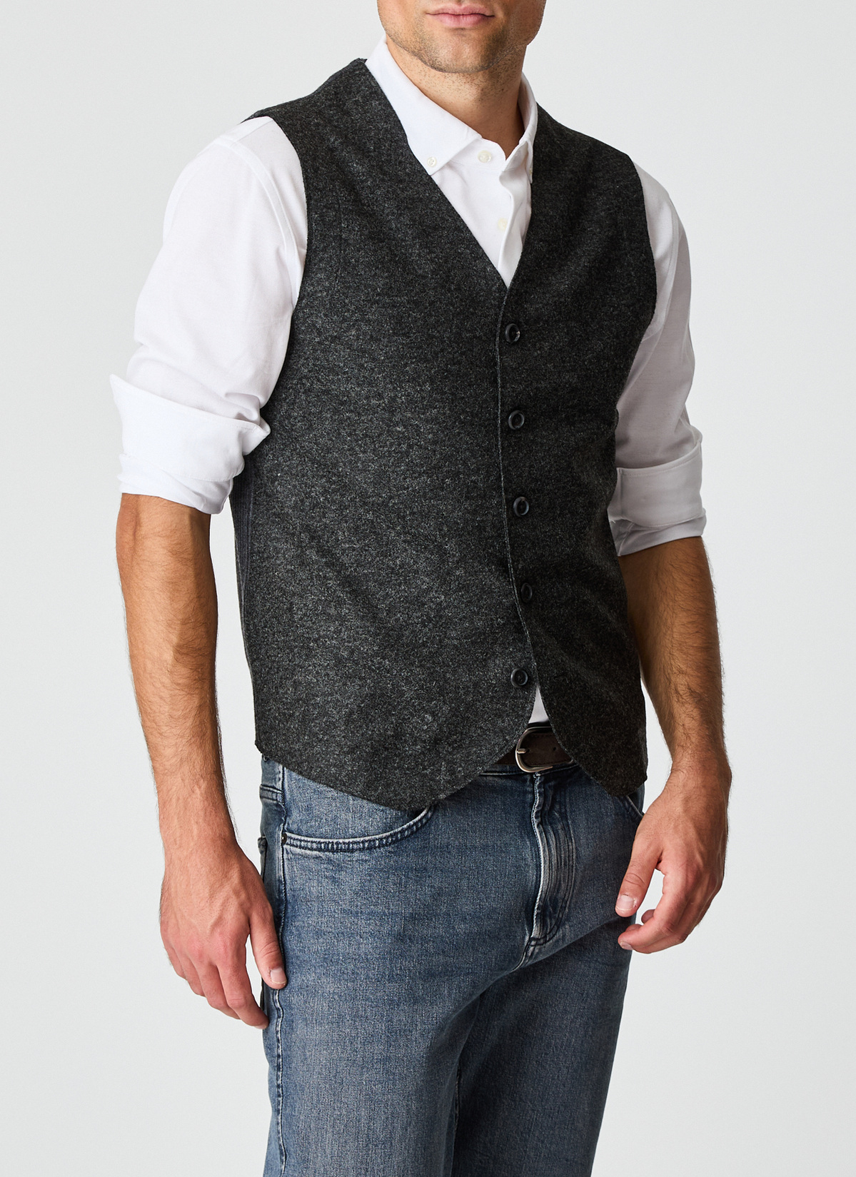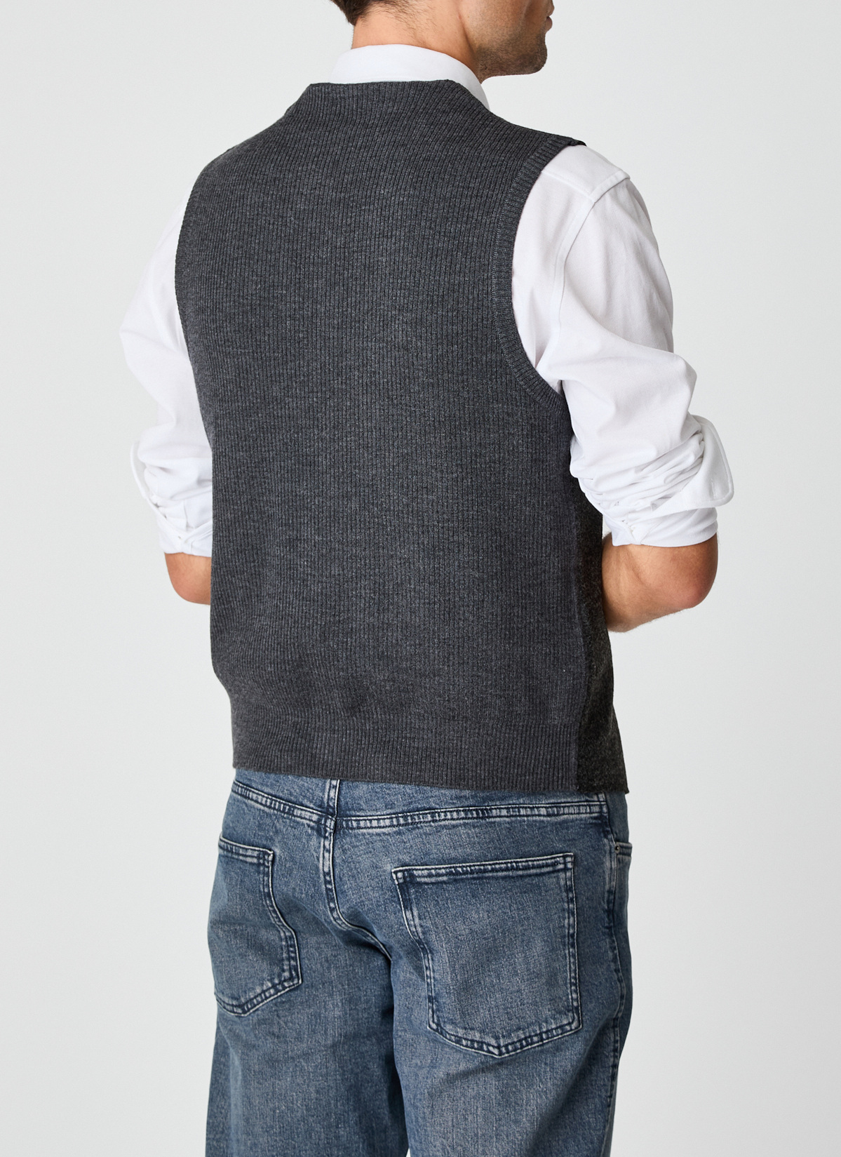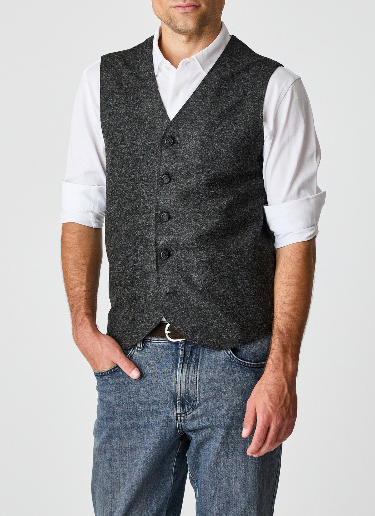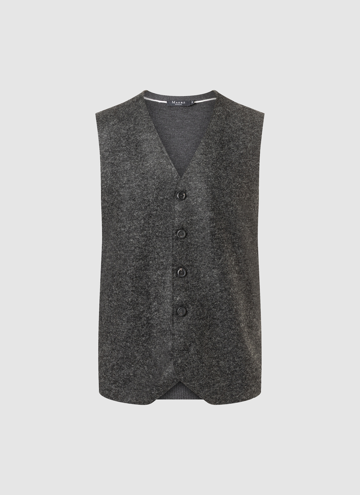 Diese Herrenweste überzeugt mit einem ausgewogenen Zusammenspiel aus klassischer Form und modernen Materialien. Der V-Ausschnitt in Kombination mit der durchgehenden Knopfleiste sorgt für eine klare, gepflegte Optik. Die Passform im Modern Fit trägt sich angenehm ohne einzuengen. Die Vorderseite ist aus weichem Wolljersey gearbeitet, die Rückseite aus feinem Strick. Gefertigt aus extrafeiner Merinowolle fühlt sich die Weste weich auf der Haut an, reguliert die Körpertemperatur und bleibt dauerhaft formstabil. Die hochwertige Verarbeitung macht die Weste zu einem vielseitigen Begleiter für geschmackvolle Lagenlooks. Besonders geeignet für Kombinationen mit Hemd oder leichtem Pullover.