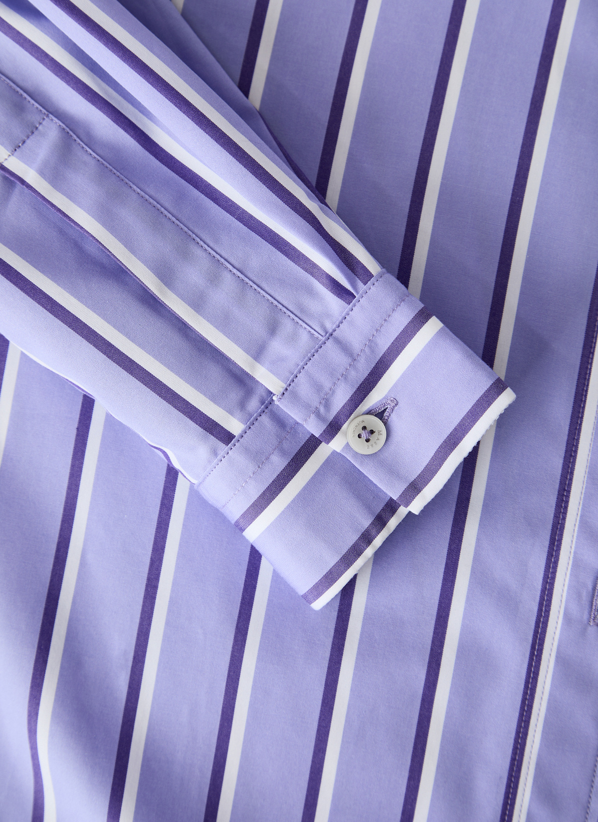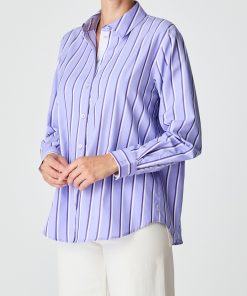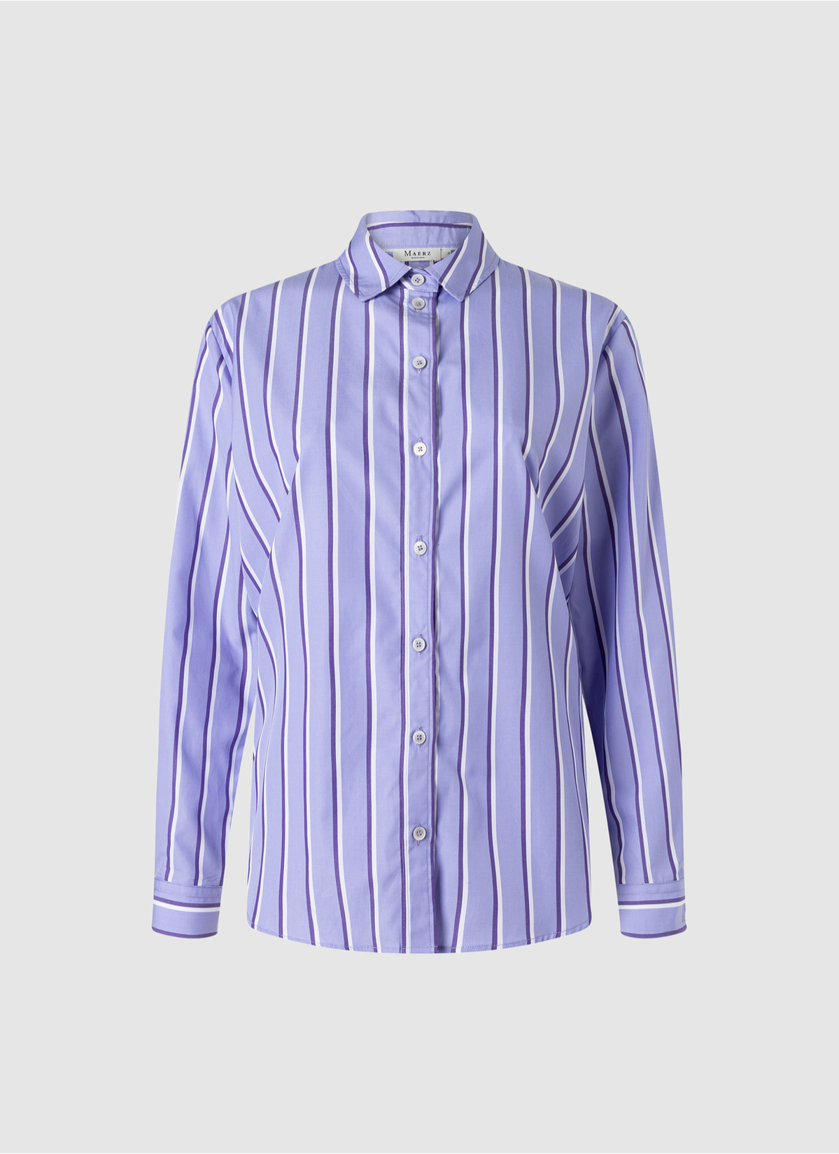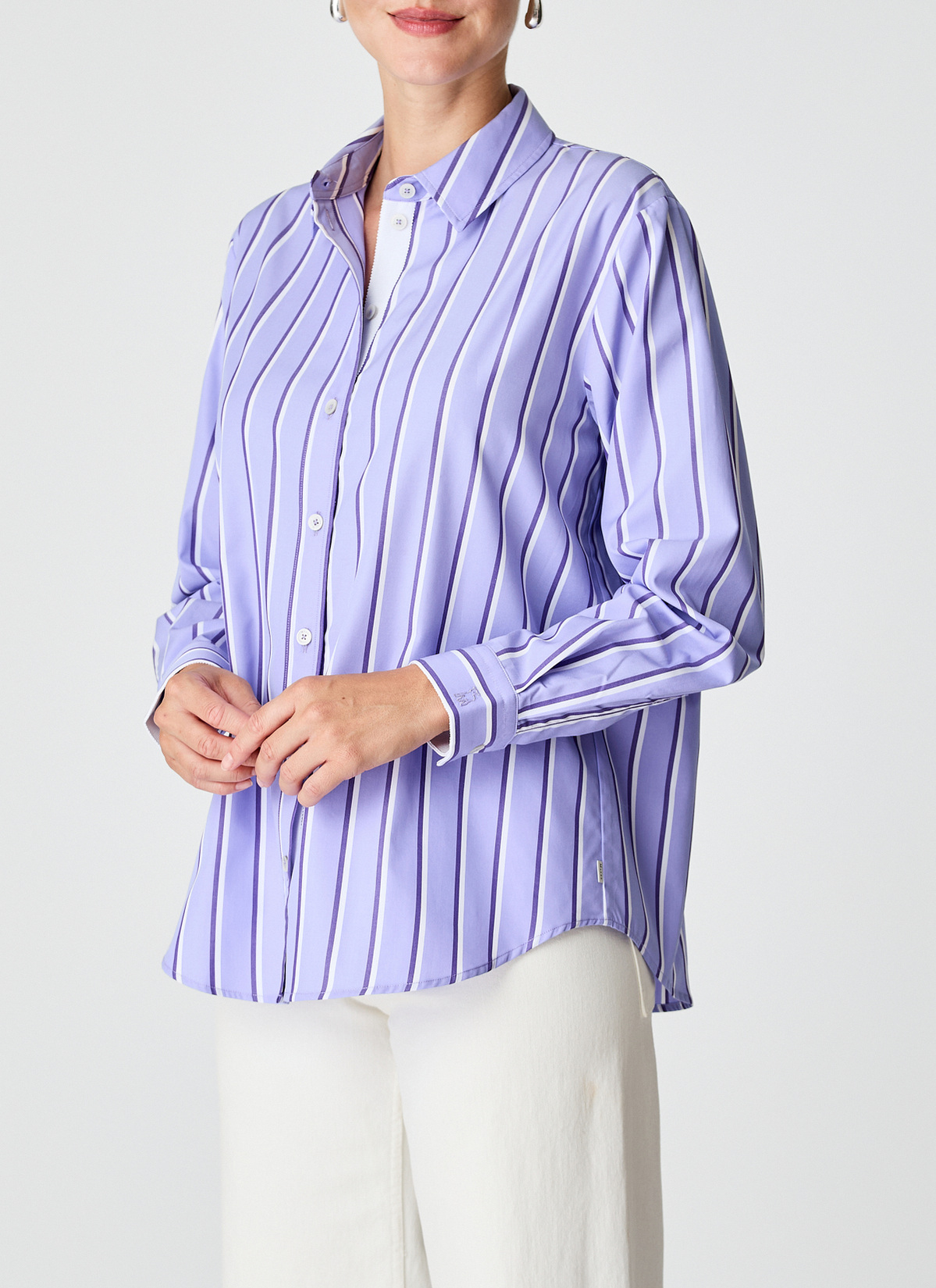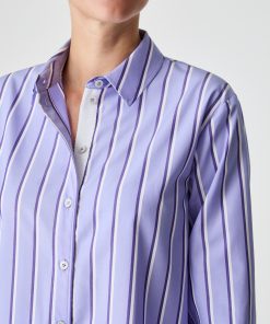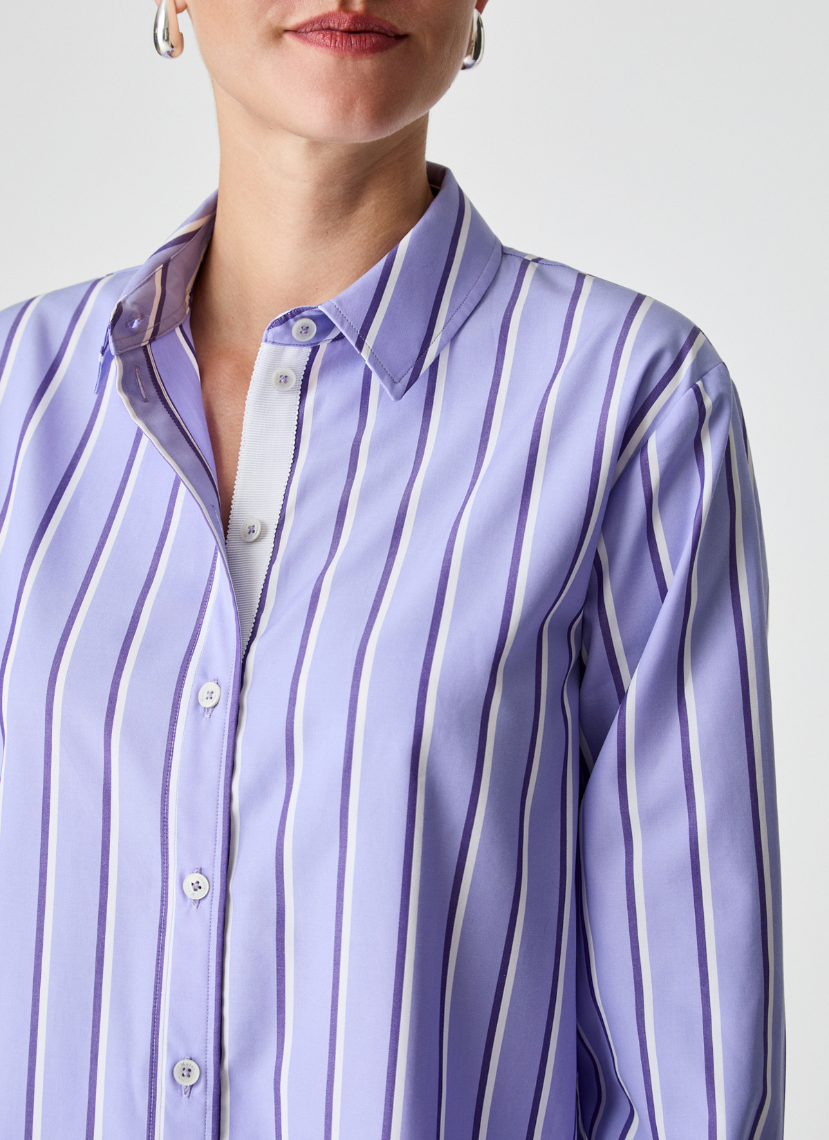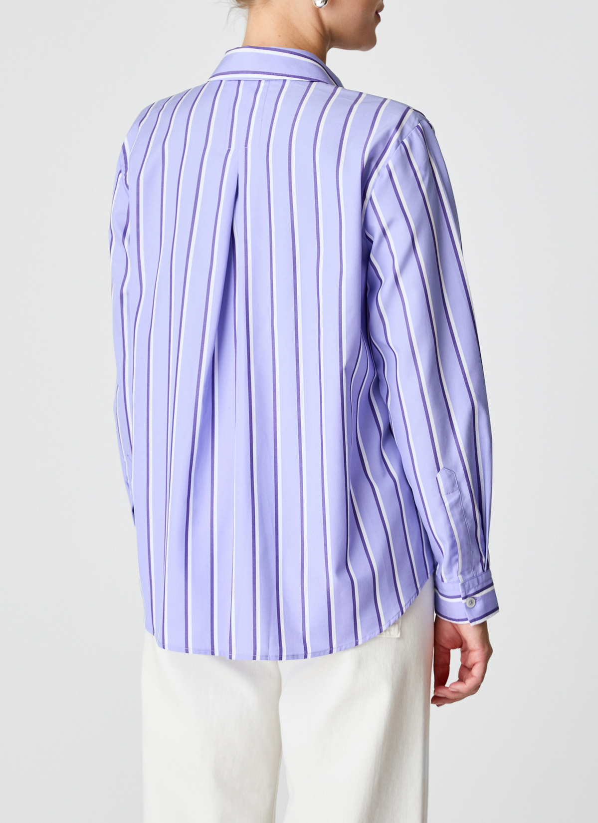 Die gestreifte Bluse überzeugt mit einem lässigen Oversized Fit und einer modernen, femininen Ausstrahlung. Der abgerundete Saum und die Kellerfalte auf der Rückseite verleihen dem Schnitt eine sanfte Weite und unterstreichen die lockere Silhouette. Gefertigt aus formstabilem Baumwoll-Popelin fühlt sich das Modell angenehm glatt an, ist atmungsaktiv und bewahrt zuverlässig seine Form. Das klassische Streifenmuster sorgt für einen frischen, zeitlosen Look. Ein stilvoller Begleiter für vielseitige Outfits mit entspanntem Chic.