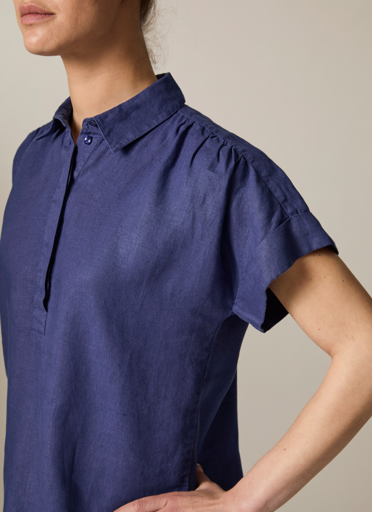 Die Kurzarm Bluse im Relaxed Fit zeigt sich mit überschnittenen Schultern und verdeckter, halber Knopfleiste. Die Falten an den Schultern geben der Bluse eine schöne, leichte Struktur und unterstreichen ihren entspannten Look während die Quetschfalte auf der Rückseite der Bluse einen femininen Touch verleiht. Material: gefertigt aus Leinen ist die Bluse wunderbar kühlend und atmungsaktiv. Haptik: kernig und kühl im Griff. Styling-Tipp: kombiniert im Set mit der passenden Shorts (Art. Nr.: 162200) wirkt der Look besonders stimmig. Good to know: durch den Garment Dye Färbeprozess ist jedes Stück ein Unikat.
