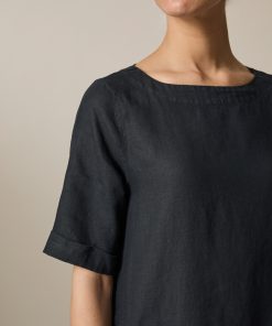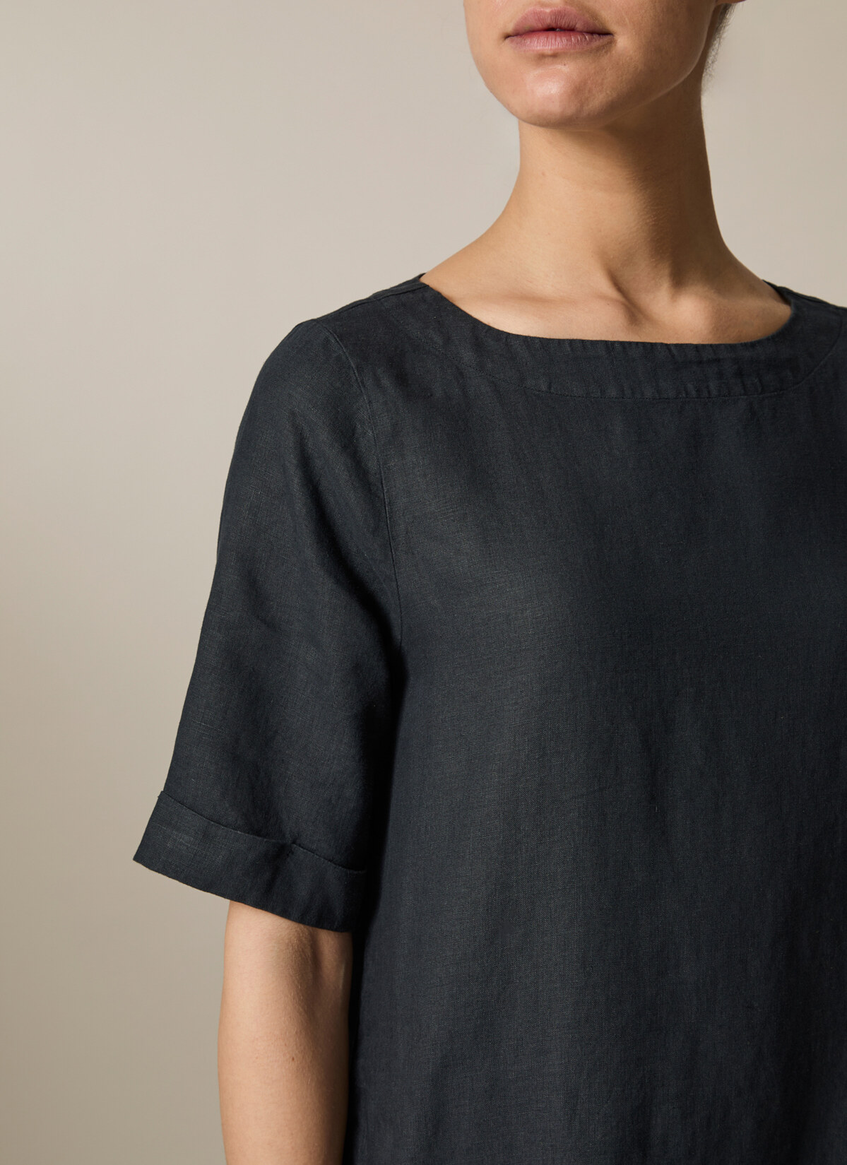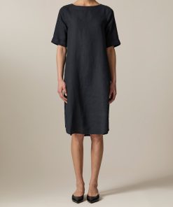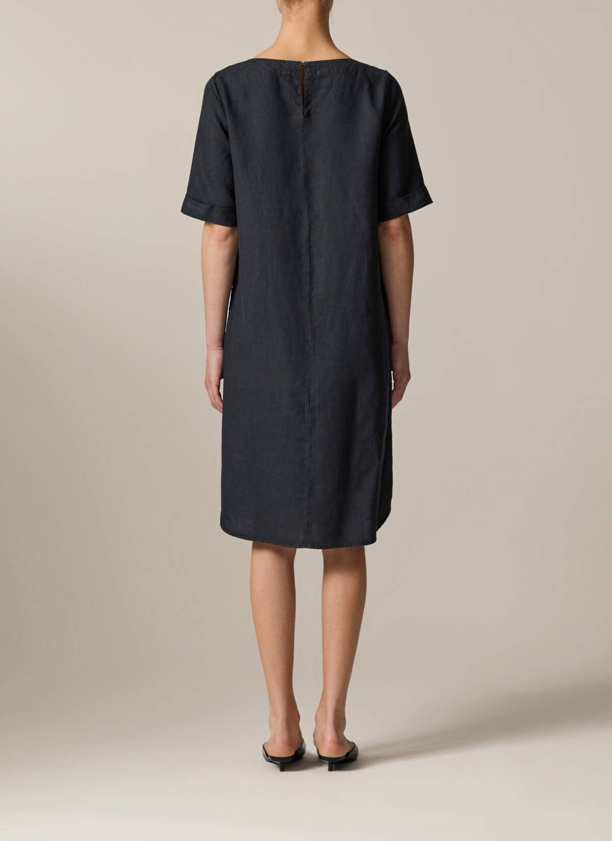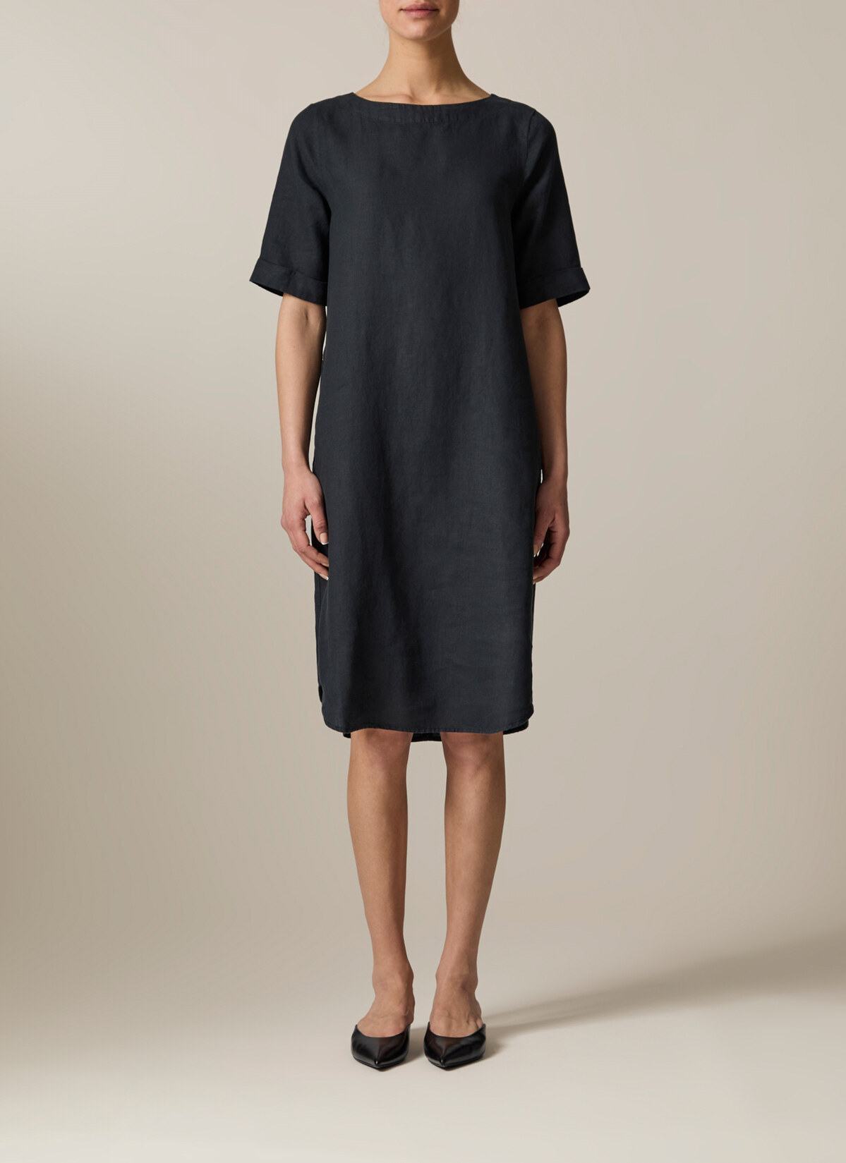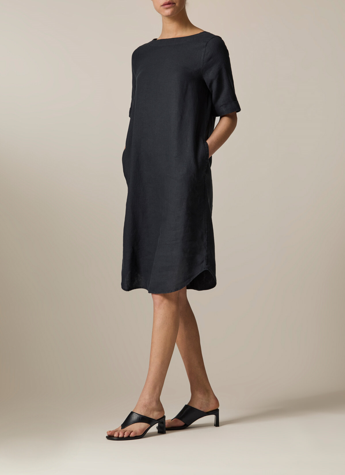 Das Kleid im entspannten Relaxed Fit zeigt sich mit Rundhalsausschnitt sowie zwei seitlichen Eingriffstaschen. Material: gefertigt aus Leinen ist das Kleid wunderbar kühlend und atmungsaktiv. Haptik: kernig und kühl im Griff. Styling-Tipp: für einen entspannten Look mit den Lieblings Sneakers kombinieren.