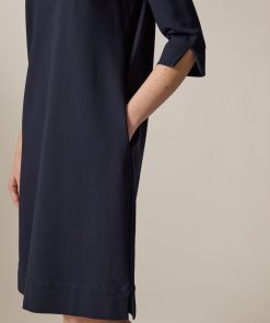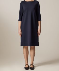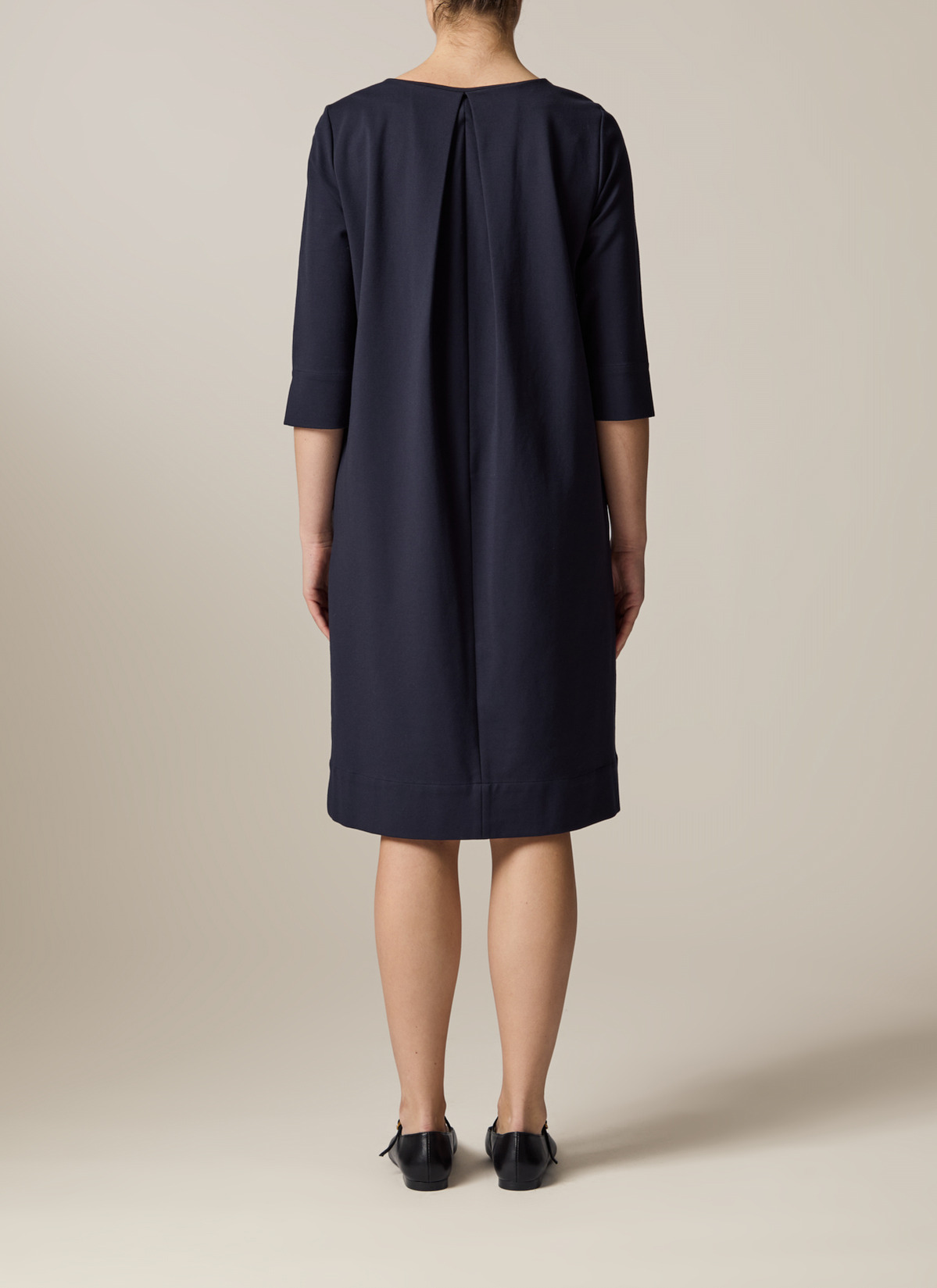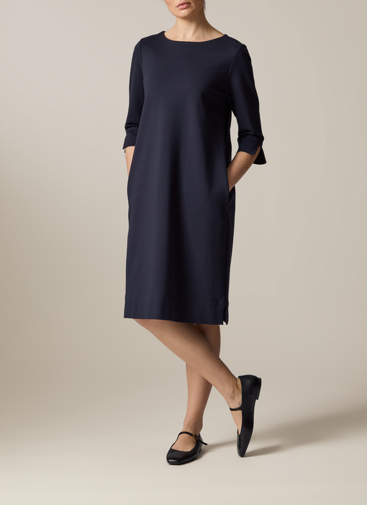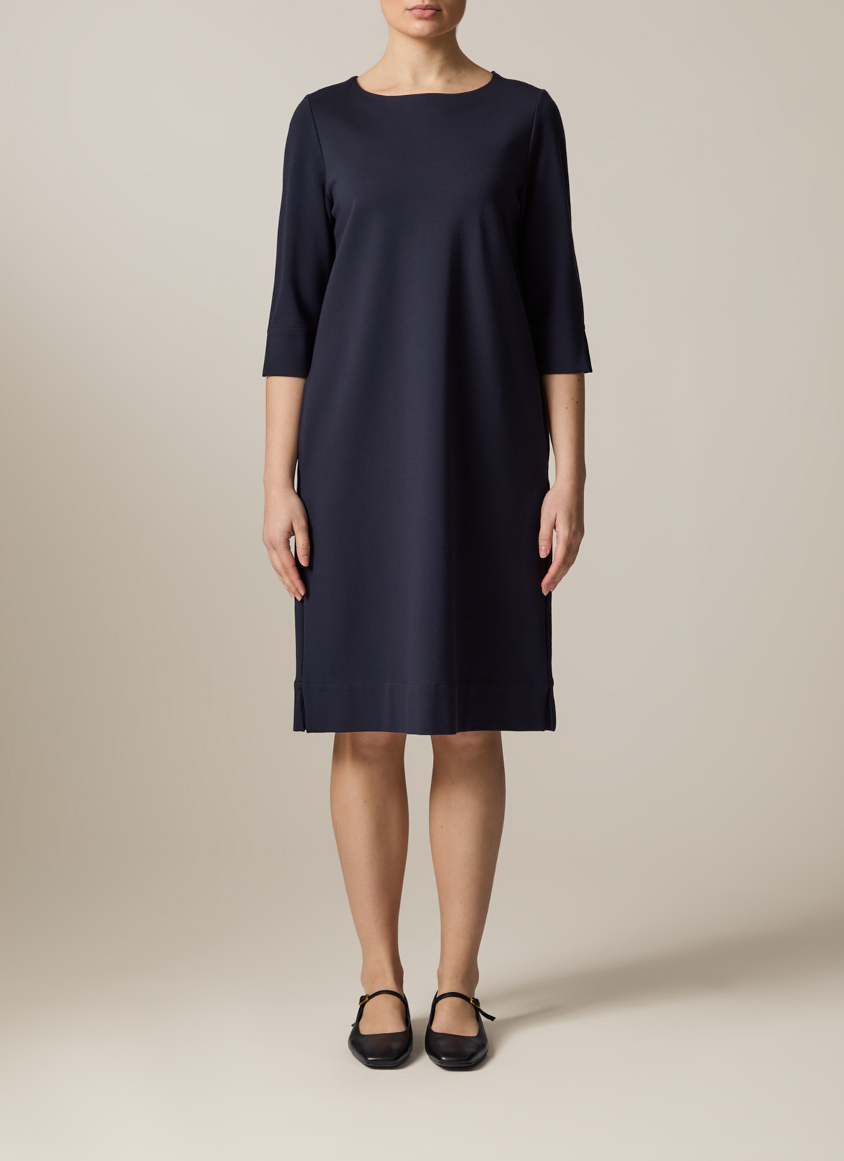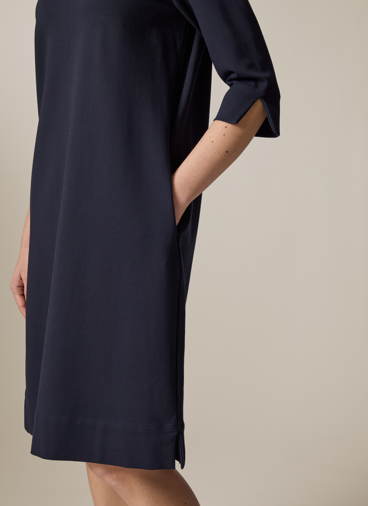 Das Kleid im Classic Fit zeigt sich in elegantem A-Linien Schnitt mit dreiviertel Ärmeln. Die Kellerfalte auf der Rückseite verleiht dem Kleid das besondere Etwas und sorgt für einen femininen Fall. Material: gefertigt aus Punta di Roma Jersey ist das Kleid besonders glatt und formstabil. Gleichzeitig bleibt es angenehm elastisch. Styling-Tipp: passend im Set kombiniert mit unserer Jacke (Art. 127900).