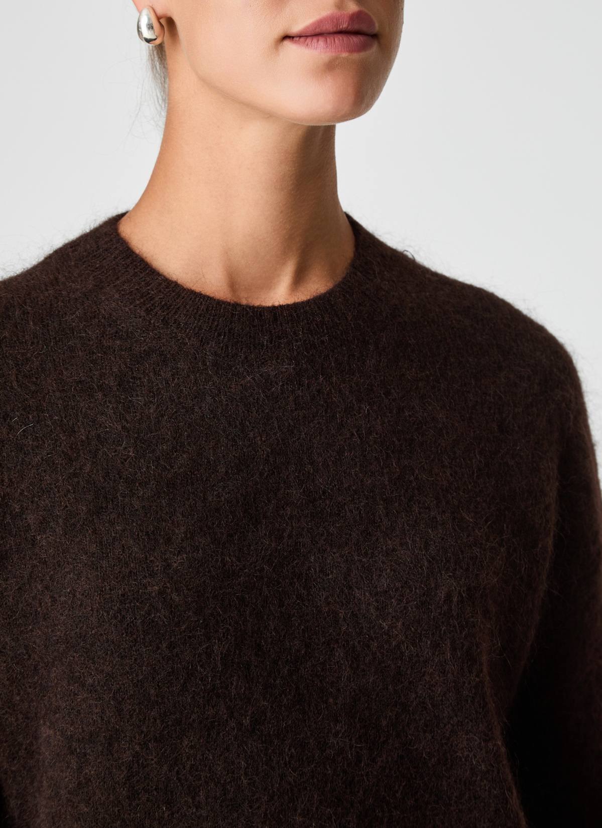 Dieser Pullover aus einer edlen Woll-Mohair-Mischung begeistert mit einer besonders weichen Haptik und flauschiger, luxuriöser Optik. Der Oversized Fit mit überschnittenen Schultern sorgt für eine moderne, lässige Silhouette, die gleichzeitig stilvoll und komfortabel wirkt. Trotz seiner weichen Struktur überzeugt das Modell durch Formstabilität und eine elastische Qualität, die ihre Form auch bei regelmäßigem Tragen bewahrt. Die fein strukturierte Oberfläche verleiht dem Pullover eine leichte, feminine Ausstrahlung und macht ihn zu einem vielseitigen Begleiter. Ein stilvolles Lieblingsstück mit hochwertigem Tragegefühl für entspannte und dennoch gepflegte Looks.