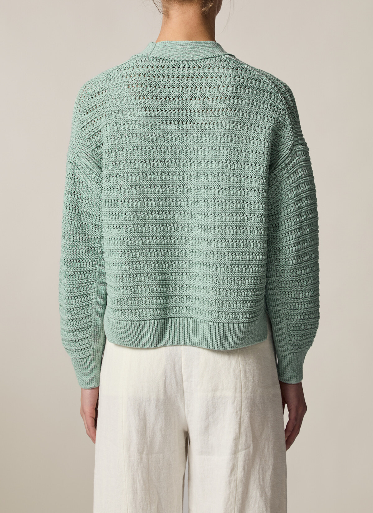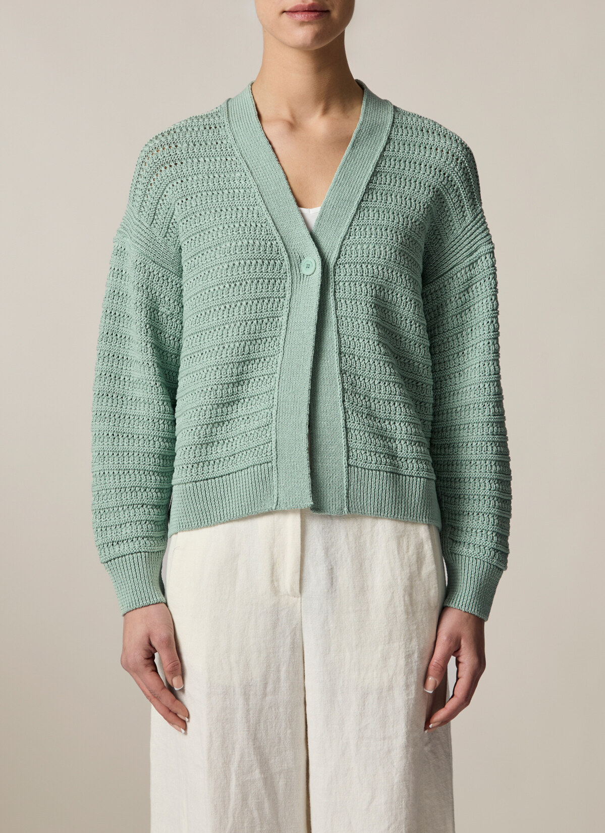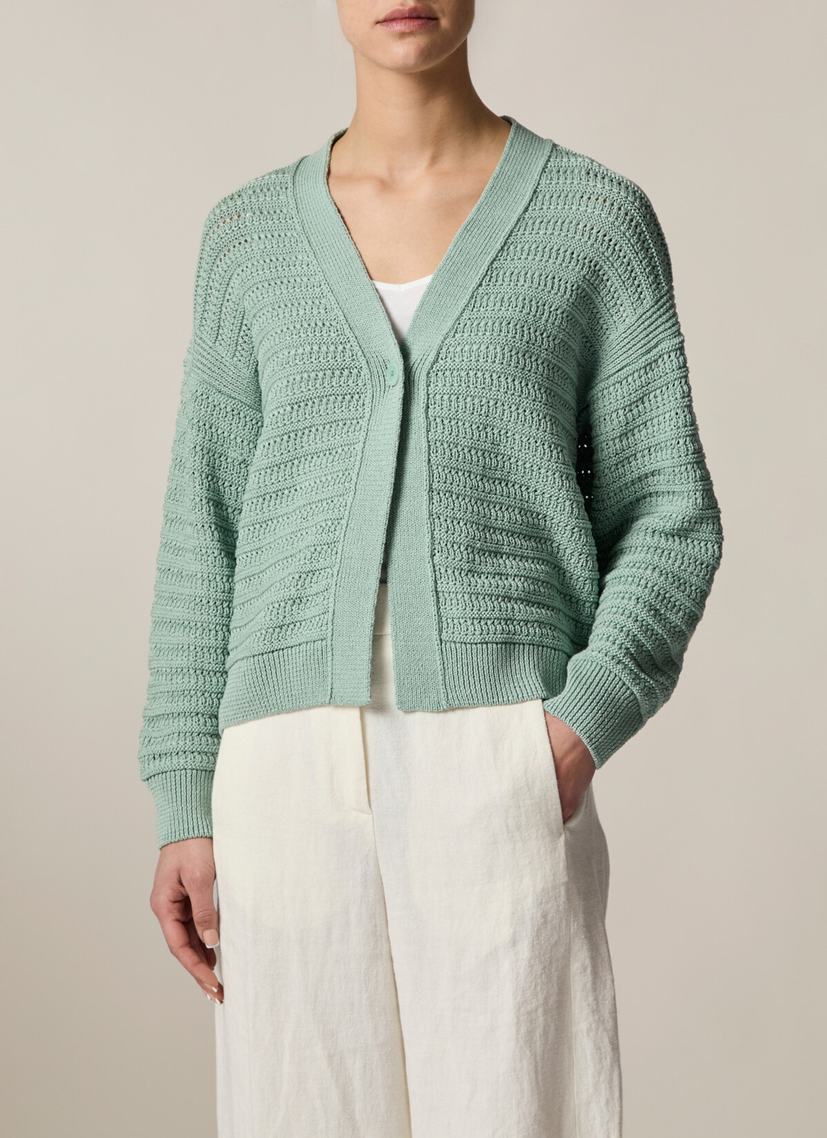 Die Strickjacke zeigt sich im Oversized Fit mit V-Ausschnitt und Statement Struktur. Die überschnittenen Schultern sowie der Einzelne Statement Knopf verleihen der Jacke einen entspannten Look. Material: gefertigt aus merzerisierter Baumwolle ist die Jacke besonders hautfreundlich und besitzt einen edlen Glanz. Haptik: die Jacke ist kühl und kernig im Griff. Styling-Tipp: einfach mit einem Lieblings Basic Shirt kombinieren.