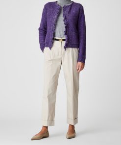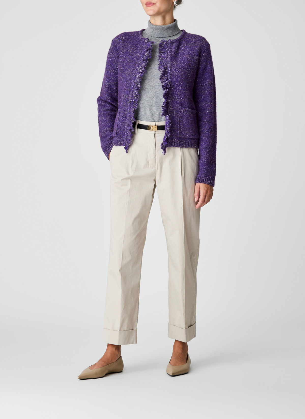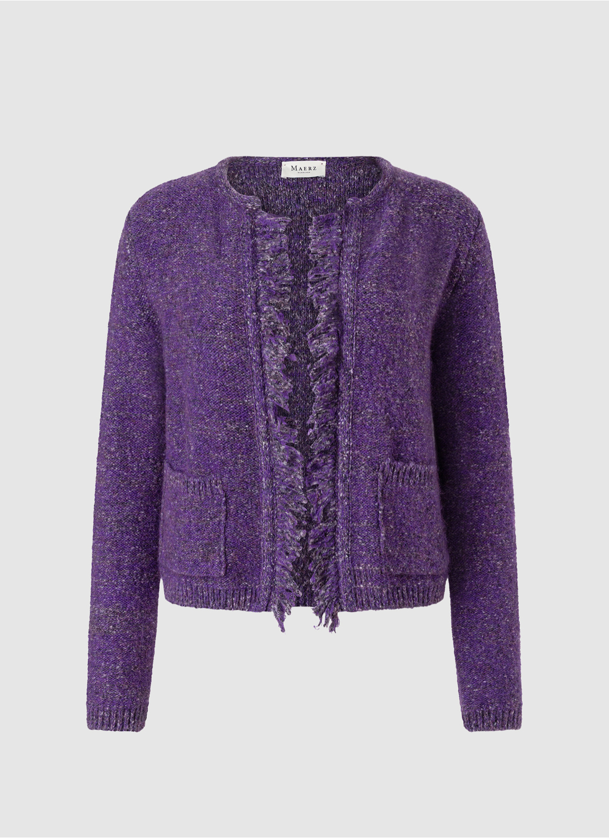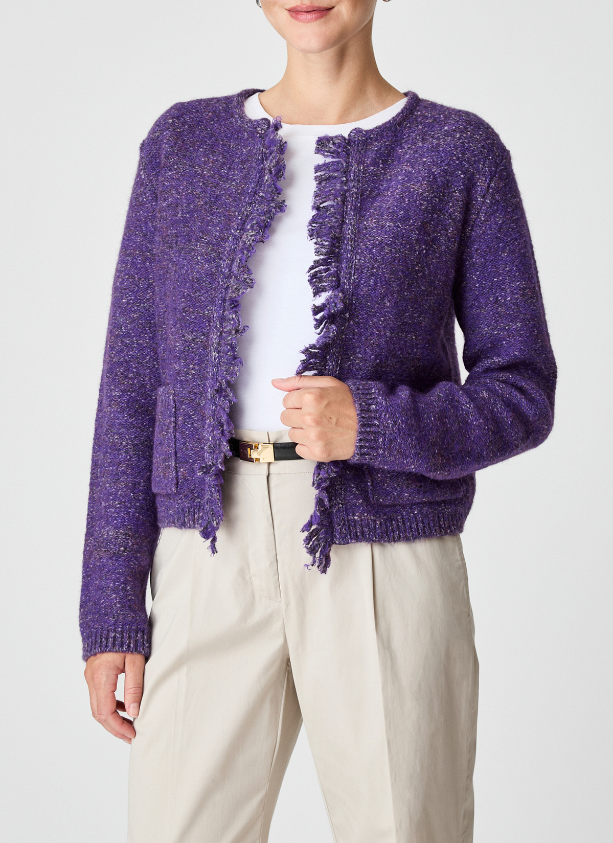 Diese hochwertige Damenstrickjacke aus einem edlen Alpaka-Baumwollmix überzeugt durch ihre weiche Haptik und natürliche Wärme. Die aufwendige Mouliné-Struktur in stilvoller Tweedoptik verleiht dem Modell eine lebendige, dennoch zeitlose Ausstrahlung. Ein klassischer Rundhalsausschnitt, dekorative Fransendetails und aufgesetzte Taschen sorgen für feminine Akzente mit besonderem Charme. Dank des feinen Phantasiegarns wirkt das Strickbild besonders ausdrucksstark und individuell. Ideal für alle, die Komfort, Qualität und stilvolle Details in einem Lieblingsstück vereint wissen möchten.